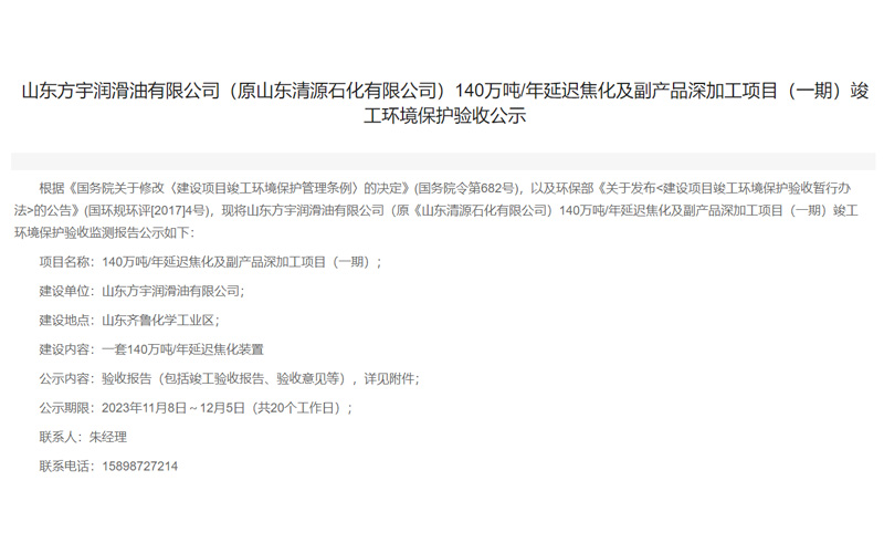 山東方宇潤(rùn)滑油有限公司(原山東清源石化有限公司)140萬噸/年延遲焦化及副產(chǎn)品深加工項(xiàng)目(一期)竣工環(huán)境保護(hù)驗(yàn)收公示